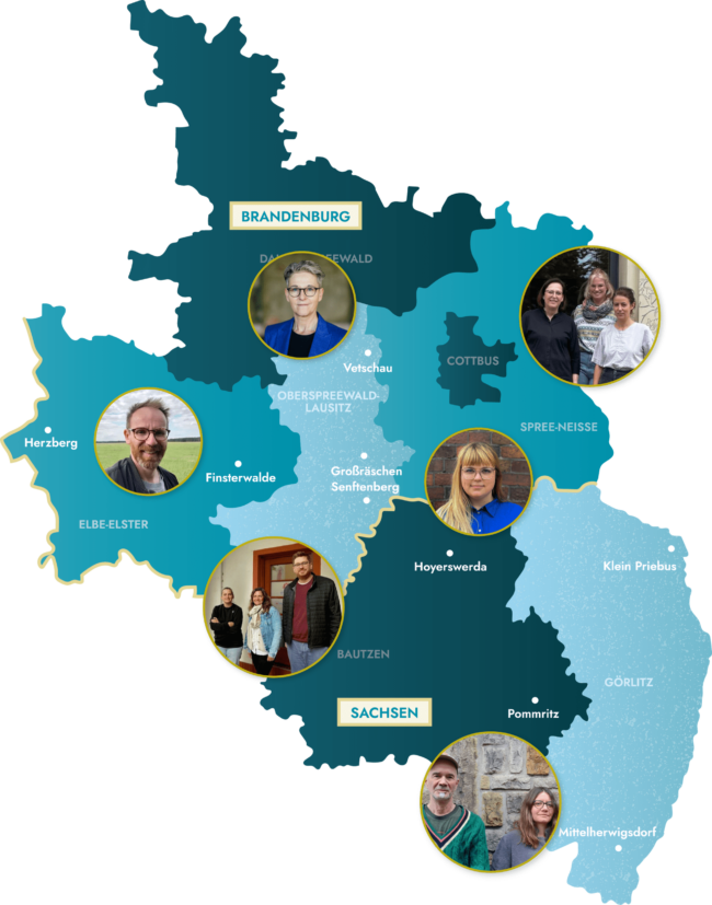 Wir haben unsere Standorte bewusst in der Fläche verteilt. Wir nennen sie Knotenpunkte, weil in ihnen die Fäden unseres Netzwerkes zusammenlaufen. Jeder Knotenpunkt hat seinen eigenen inhaltlichen Schwerpunkt. Trotzdem erreichst du an jedem Standort die Bürgerregion Lausitz. Wir fördern ehrenamtliches Engagement und freuen uns auf deine Ideen oder Wünsche. Vielleicht wird etwas daraus, was das Leben für viele Menschen in der Lausitz reicher macht.